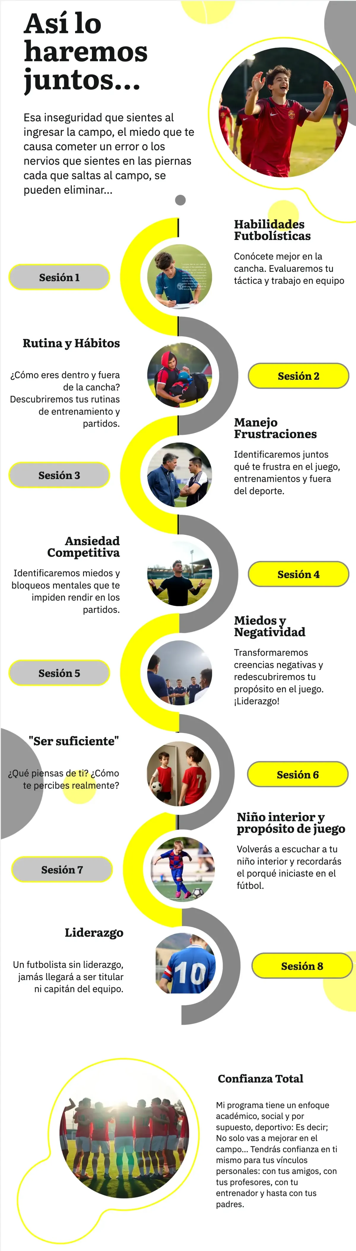 Sí, Absolutamente. Este coaching se enfoca en el "enemigo mental" que te frena, no en la técnica. Trabajamos directamente en la ansiedad competitiva y el miedo a fallar para que logres la Confianza Inquebrantable que te permite tomar decisiones rápidas y liderar la cancha.